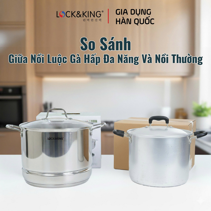 Nồi luộc gà hấp đa năng “vô địch” ở mọi tiêu chí. Thời gian luộc gà 2kg chỉ 25 phút thay vì 45–60 phút, không lo trào nước làm bẩn bếp. Một chiếc nồi thay thế 3–4 dụng cụ, từ hấp bánh chưng đến hầm canh xương. Inox 304 – loại dùng trong y tế – đảm bảo không ngấm độc tố, trong khi nồi thường dễ han gỉ, ảnh hưởng sức khỏe lâu dài. Tiết kiệm gas rõ rệt nhờ đáy 5 lớp truyền nhiệt nhanh, giảm hóa đơn tiền điện/gas hàng tháng. Về độ bền, nồi thường nhanh xỉn màu, phải thay mới; còn nồi đa năng sáng bóng suốt 5–7 năm, chỉ cần lau nhẹ là sạch.