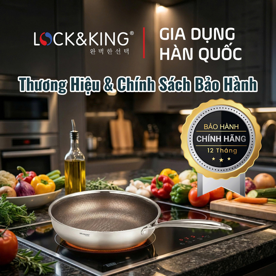 - Lock&King: Sản xuất tại Hàn Quốc, inox 316 đạt chuẩn y tế, khắc laser “SUS316” rõ nét, bảo hành 10 năm đáy, 2 năm toàn chảo, đổi mới 1:1 nếu lỗi kỹ thuật.