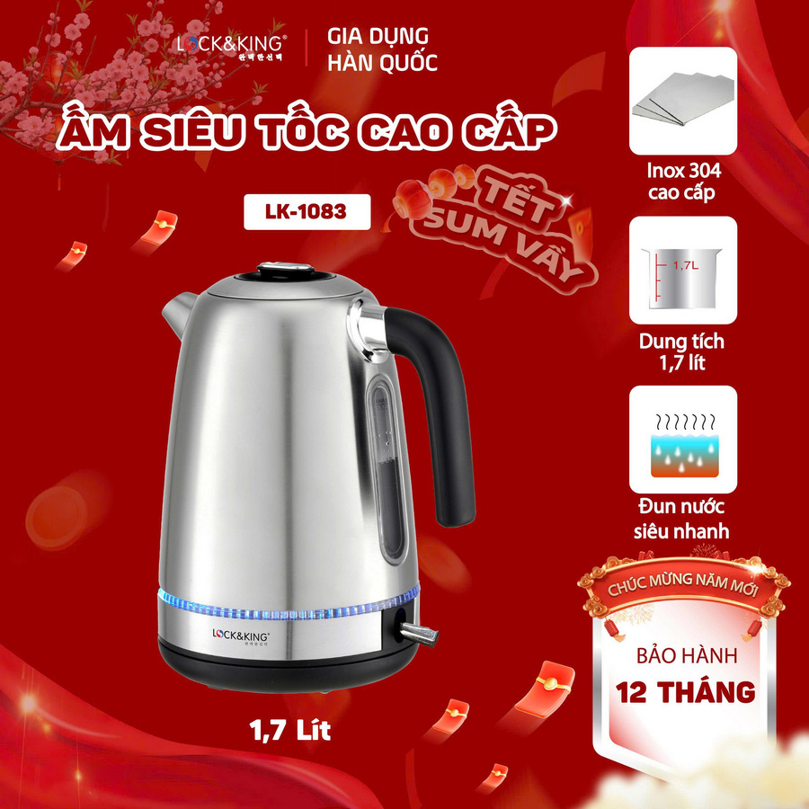 Ấm Siêu Tốc Lock&King LK-1083 – Nhanh, Bền, An Toàn là lựa chọn đáng tin cậy cho gia đình và văn phòng khi bạn cần một chiếc ấm đẹp – bền – đun sôi nhanh – an tâm sử dụng. Dung tích 1,7L đáp ứng thoải mái nhu cầu hằng ngày; thân Inox 304 cao cấp sáng bóng, chống gỉ, dễ lau chùi, giữ ấm luôn sạch và bền bỉ theo thời gian.