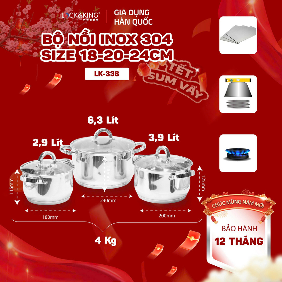 - Với chất liệu inox cao cấp, Bộ Nồi Inox 5 Đáy Cao Cấp Lock&King LK-338 không chỉ là dụng cụ nấu nướng mà còn là khoản đầu tư lâu dài cho sức khỏe, sự tiện nghi và thẩm mỹ của gian bếp.