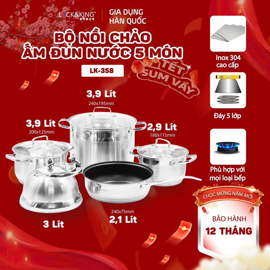 Bộ Nồi Inox 5 Đáy Cao Cấp Lock&King LK-358: Tinh Hoa Căn Bếp Hiện Đại