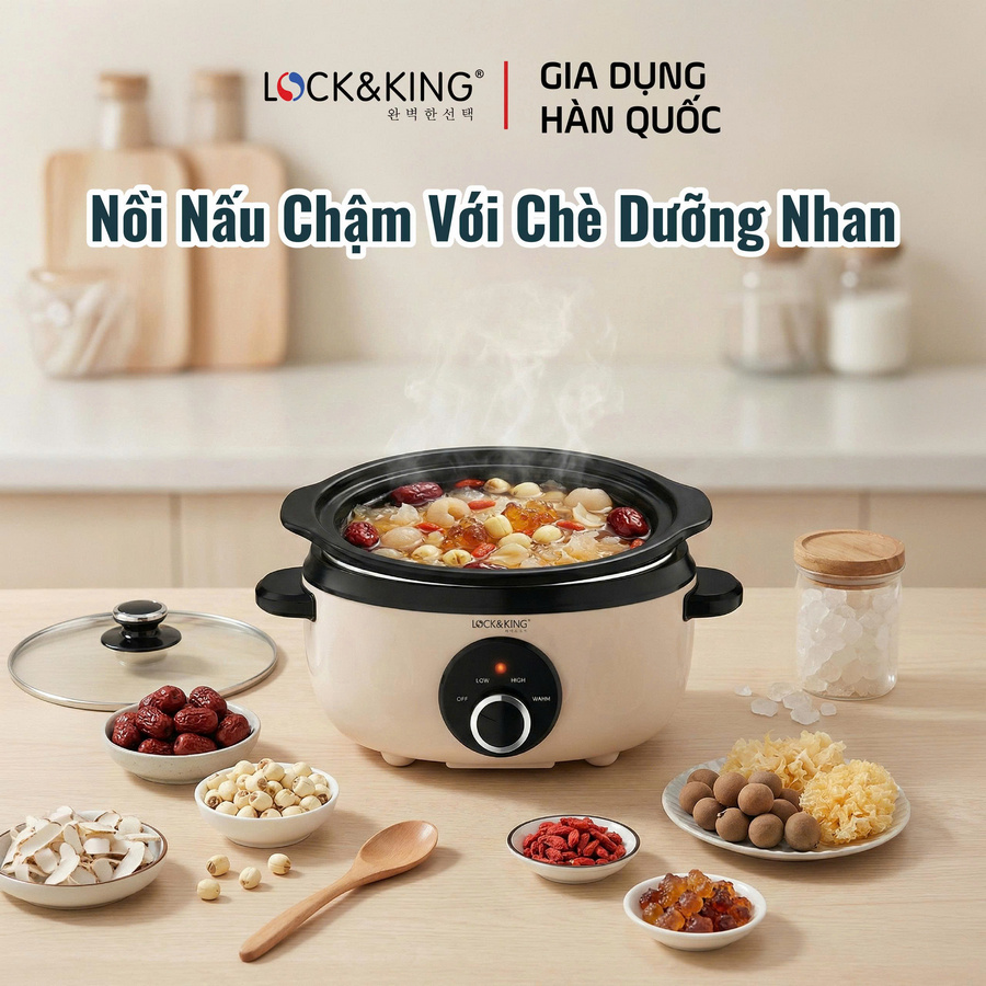 Là món tráng miệng thanh mát, bổ dưỡng, được nhiều chị em yêu thích nhờ chứa các thành phần lành tính như tuyết yến, nhựa đào, long nhãn, táo đỏ, hạt sen… Khi sử dụng nồi nấu chậm Lock&King, việc chế biến món chè này trở nên cực kỳ đơn giản mà vẫn giữ được độ trong, thơm và sánh nhẹ đặc trưng của từng nguyên liệu.